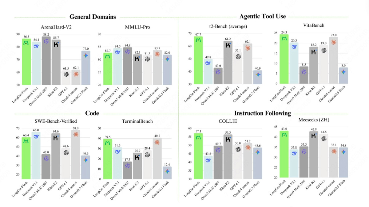 在智能体(Agentic)工具使用方面,LongCat-Flash 在 τ²-Bench 中表现超越其他模型;在 VitaBench 中以 24.30 的得分位列第一,彰显出在复杂场景中的强大处理能力。